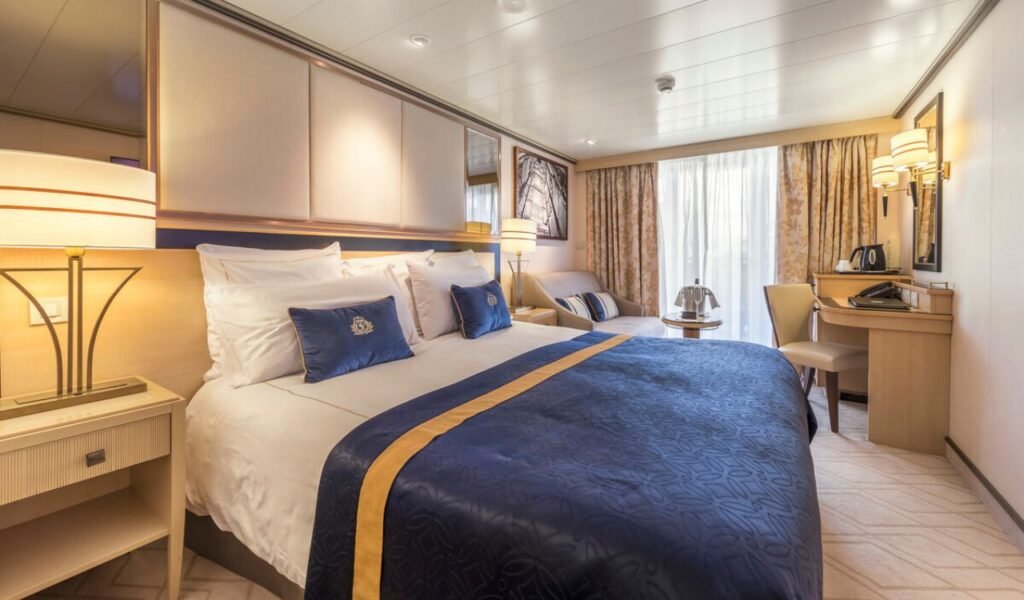 Unsere Kabine der Kategorie BV (Balkonkabine 4037 mit Balkonwand aus Stahl) bot 18 m² Wohnfläche plus 5 m² Balkon und war eher klassisch eingerichtet. Die Farbgestaltung in Braun-Beige mit blauen Akzenten wirkte angenehm warm. Besonders schön fanden wir die Zierkissen mit goldener Paspelierung und Stickerei – ein kleines Detail, das sofort Luxusflair aufkommen ließ. Die Betten waren, wie man es von Cunard erwartet, äußerst bequem – wir haben geschlafen wie Murmeltiere.