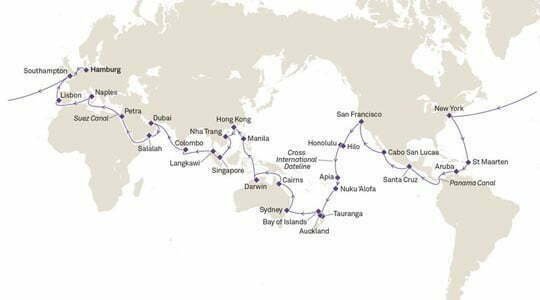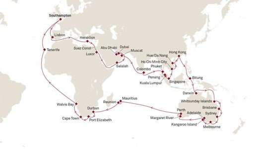 Die Queen Mary 2 nimmt Sie von Southampton aus mit auf eine103-tägige Traumreise. Mit ihr reisen Sie vom Mittelmeer durch den Suezkanal in die Vereinigten Arabischen Emirate. Anschließend geht es weiter nach Asien. Malaysia, Singapur, Vietnam und China warten darauf, von Ihnen entdeckt zu werden. An Australiens Küsten warten dann jeden Tag neue große und kleine Abenteuer auf Sie. Und in Südafrika erleben Sie exotische Artenvielfalt und überwältigende Natur bevor Sie nach einigen entspannten Seetagen und einem Besuch auf Teneriffa wieder in Southampton anlanden.