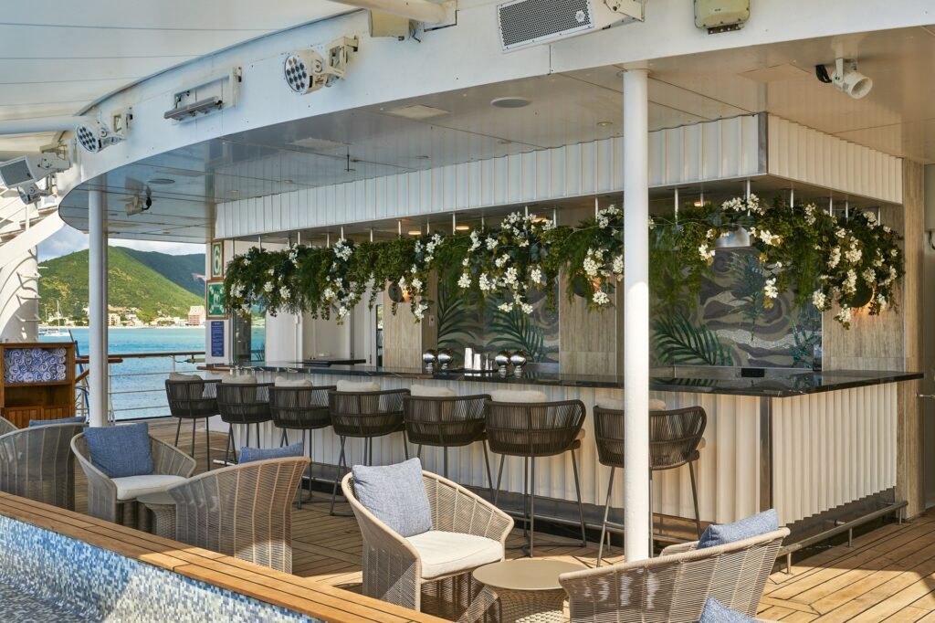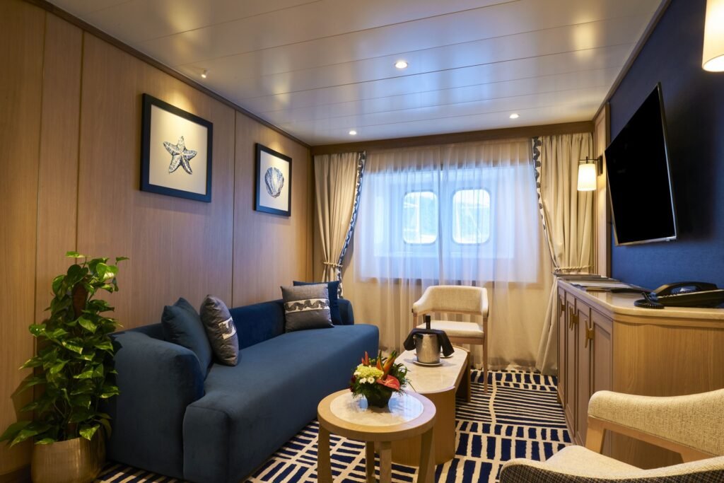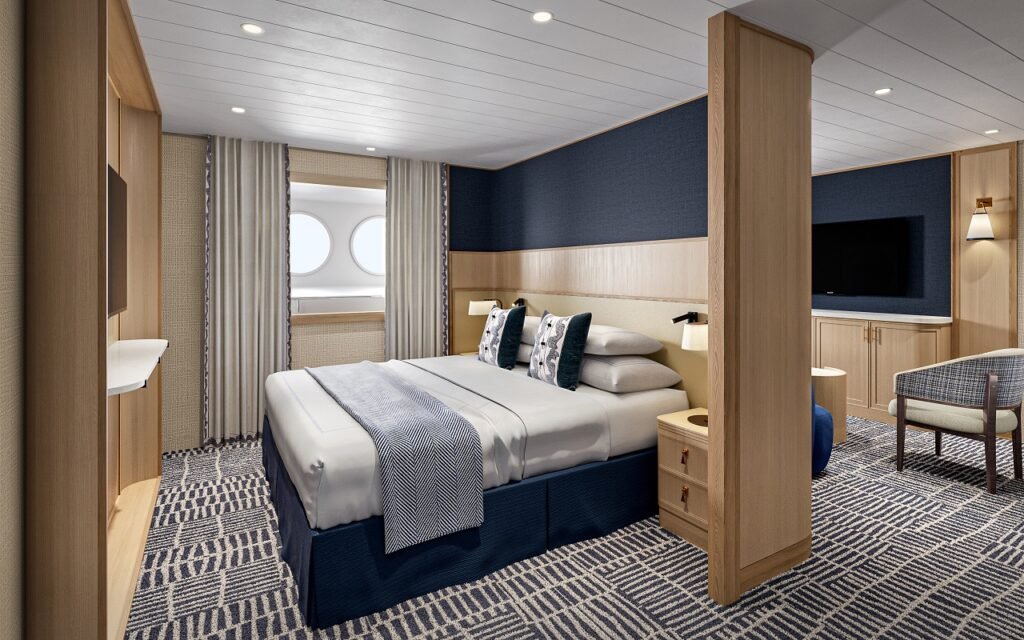 Die neue Owner’s Suite #501 der Wind Surf, die bei der letzten Renovierung als Officer’s Suite eingeführt wurde, wurde neu gestaltet. Der Raum wurde erweitert und umfasst einen separaten Wohn- und Schlafbereich. Das komplett neue Badezimmer verfügt über eine geflieste Badewanne, eine neue Dusche und einen Doppelwaschtisch. Was sich nicht ändern wird? Die Gäste haben nach wie vor ihren einzigartigen Zugang zur Suite durch eine private Tür auf einem Außendeck – und die Suite liegt direkt neben der Brücke.