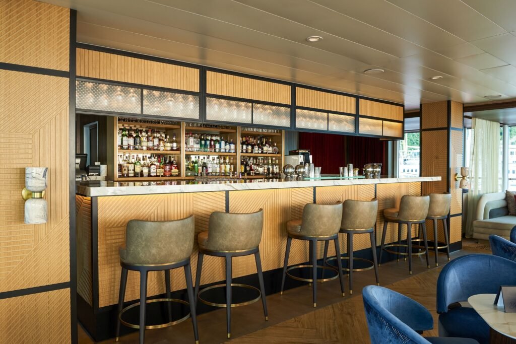 Die Compass Rose Lounge und Bar, der Ort an Bord für einen guten Drink oder Musik und Unterhaltung, erhielt ein modernes Dekor mit blauen und orangefarbenen Akzenten, eine schicke Bar und einen neuen Mehrzweckbühnenbereich