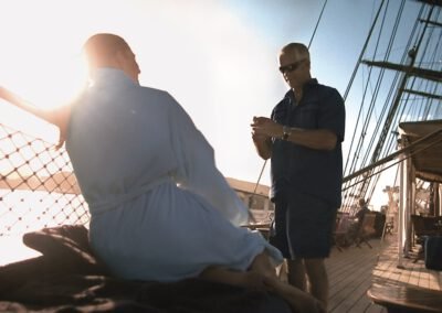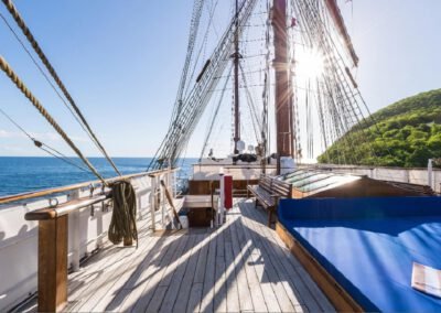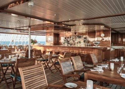 An Bord der kleinen Sea Cloud-Flotte werden die Segel noch von Hand gesetzt. Nichts geschieht per Knopfdruck. Ein besonderes Erlebnis für alle Gäste, die die Schiffscrew bei ihren geschickten Handgriffen beobachten können. Auch auf der Brücke sind Gäste (fast) immer willkommen. 64 bis maximal 136 Passagiere erleben so Privatyachtflair und unkomplizierte Begegnungen mit den anderen Reisenden und der Crew.